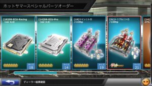 車の強化はストーリー、イベント、ガチャなどで入手したパーツを取り付けることによって強化されていきます。